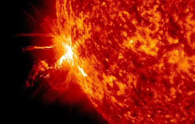 Вспышка на Солнце, 10 июня 2014. Согласно исследованиям ученых, аномально сильные солнечные бури, которые случаются несколько раз в десятилетие, возникают в результате столкновения волн солнечной плазмы, выброшенной в космическое пространство почти в одно и то же время.