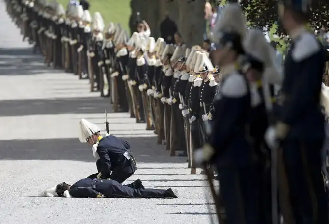 Большая ответственность. Солдат не выдержал и упал в обморок на церемонии крестин дочери шведской принцессы Мадлен Леонор. Церковная церемония прошла 8 июня 2014 в Королевской часовне во дворце Дроттнингхолм.
