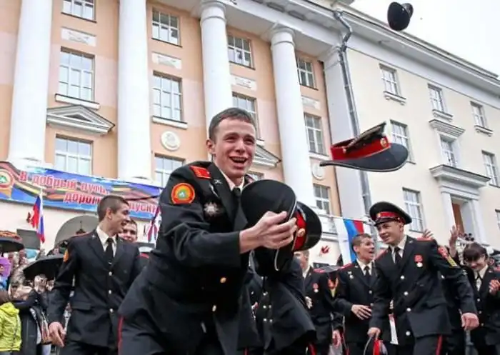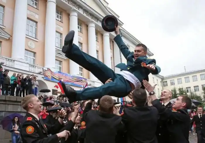 По училищной традиции курсанты накануне выпуска не спали — встречали рассвет на территории училища, а утром после вручения им аттестатов вышли на плац и бросили вверх монетки. На счастье.