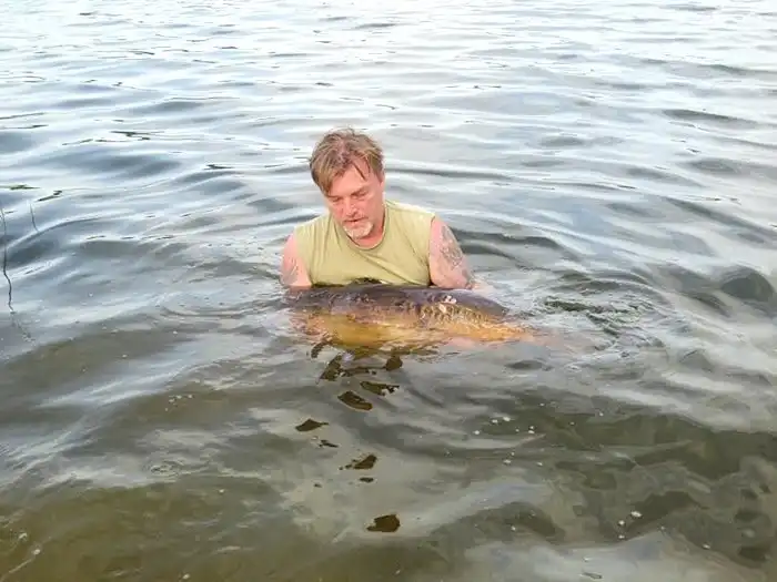 Этот карп весом 20,5 кг и ему минимум 25 лет. Рыбу выловили на Полящицком озере и выпустили обратно в водоем.