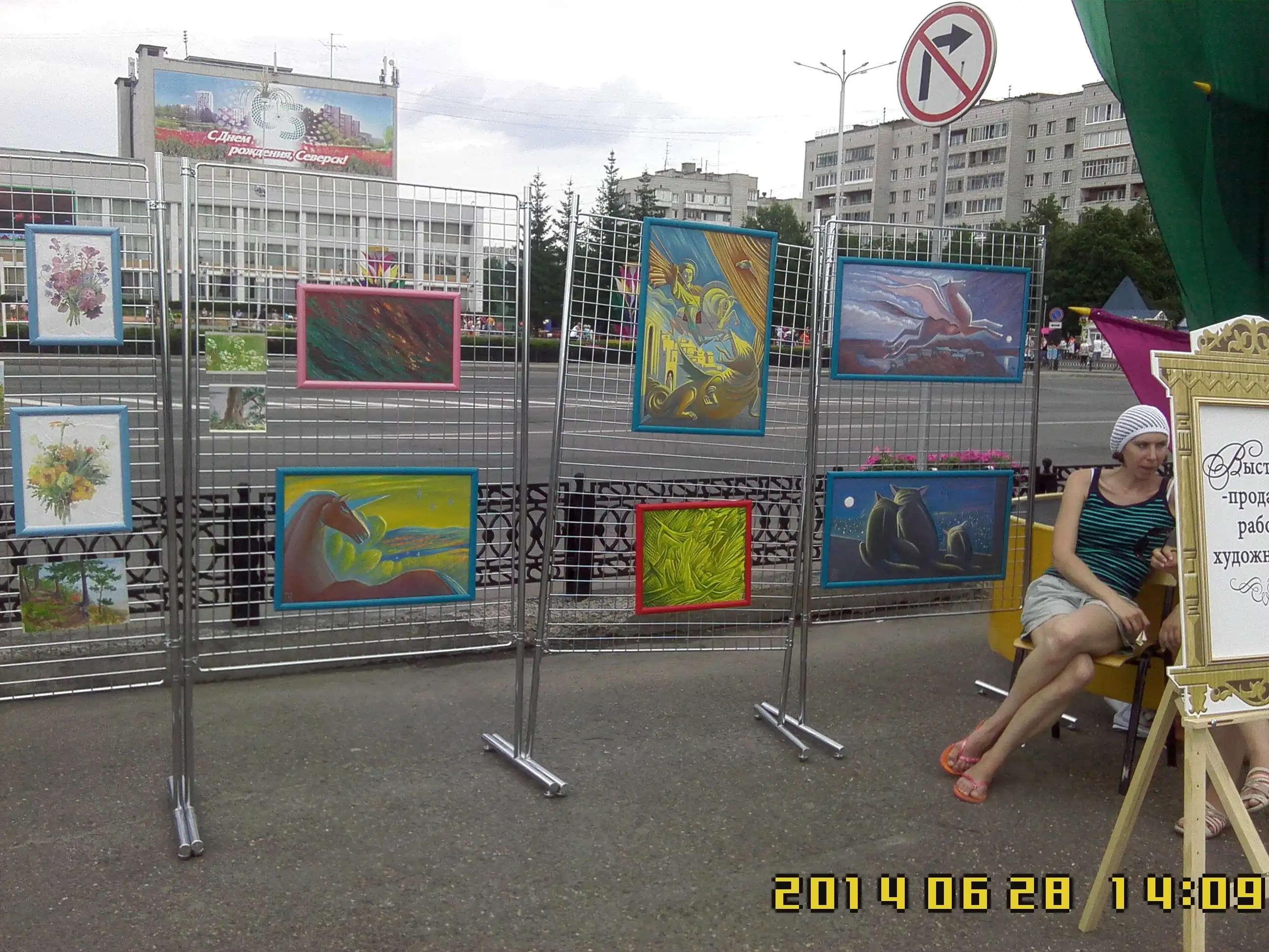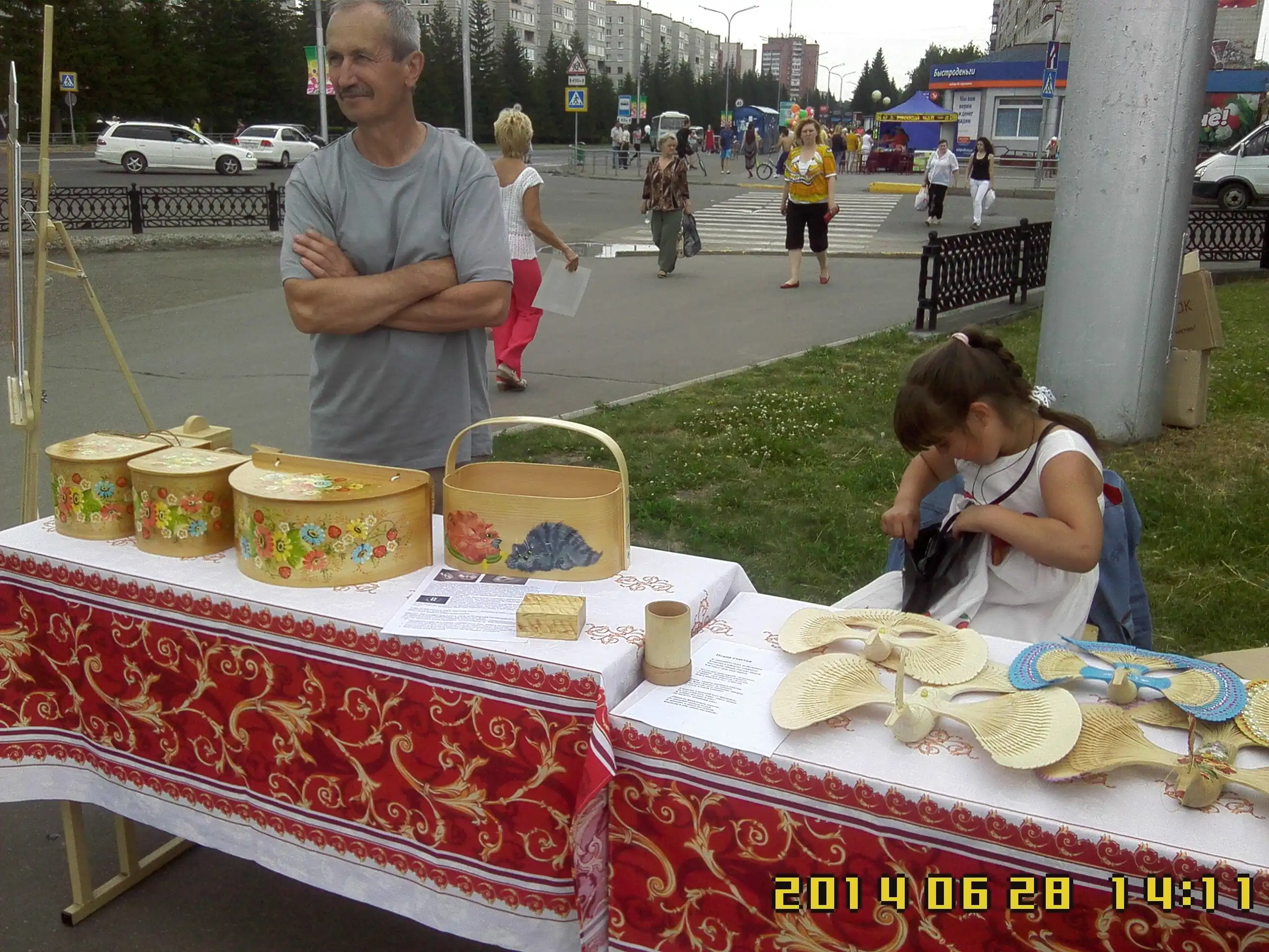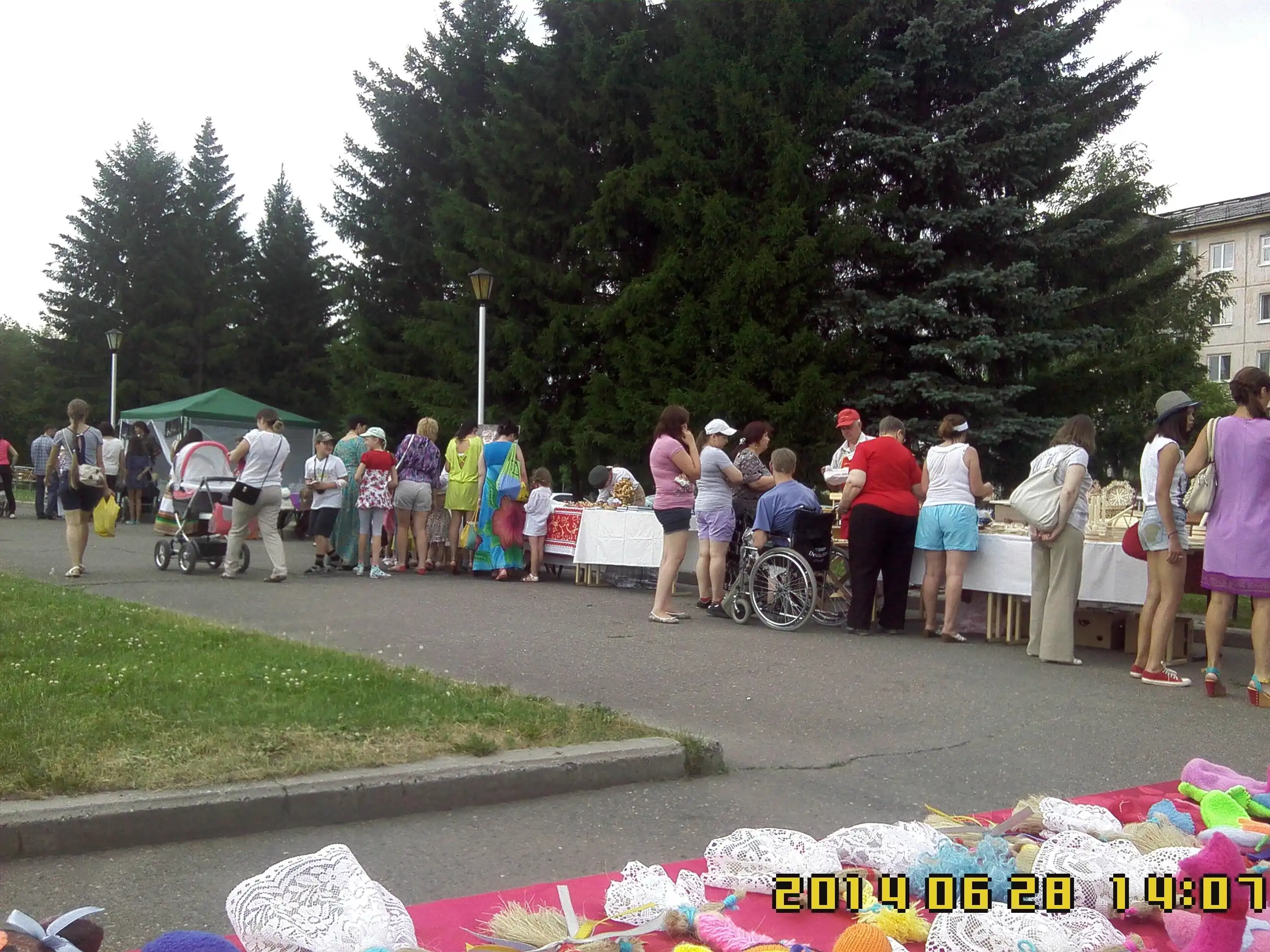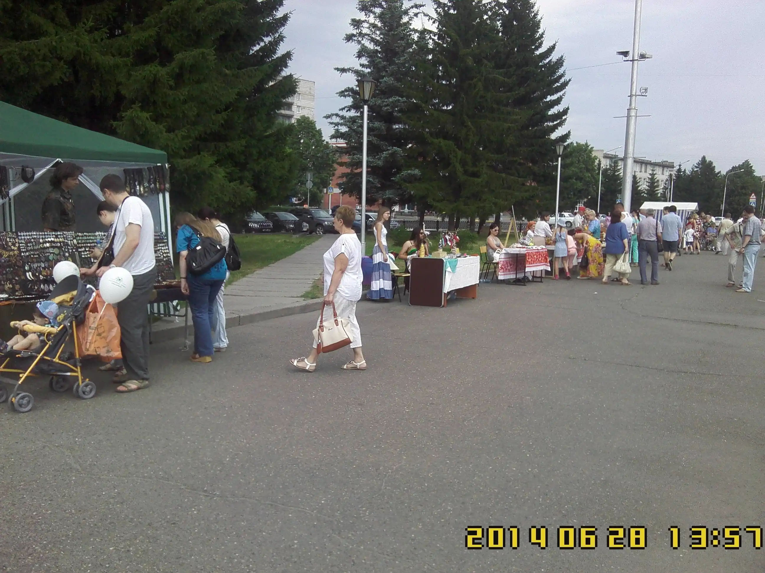 В этот день на театральной площади, напротив кинотеатра "Россия", проходила выставка-ярмарка работ Северских и Томских мастеров "Северский арбат"