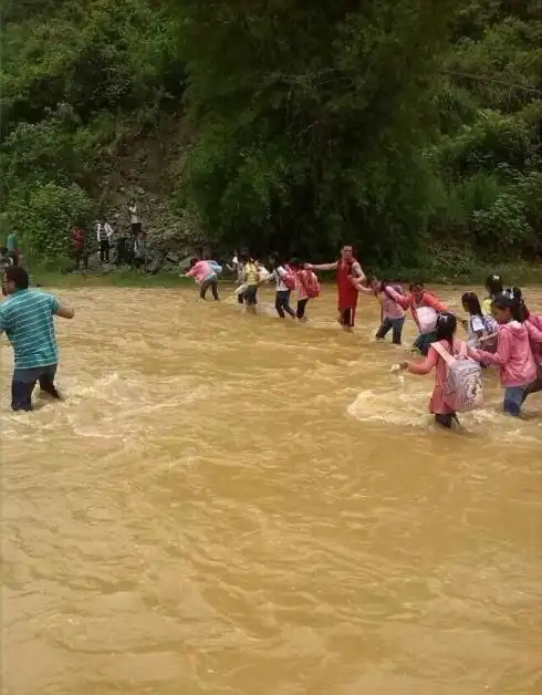 Учителя начальной школы округа Фунин, провинция Юньнань, вынуждены исполнять роль переносчиков, чтобы их ученики могли попасть на уроки. Все дело в проливных дождях, из-за которых привычная дорожка в школу превратилась в настоящую реку. Так что у детишек теперь каждый день импровизированный урок природоведения.