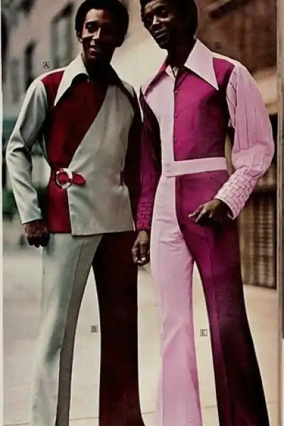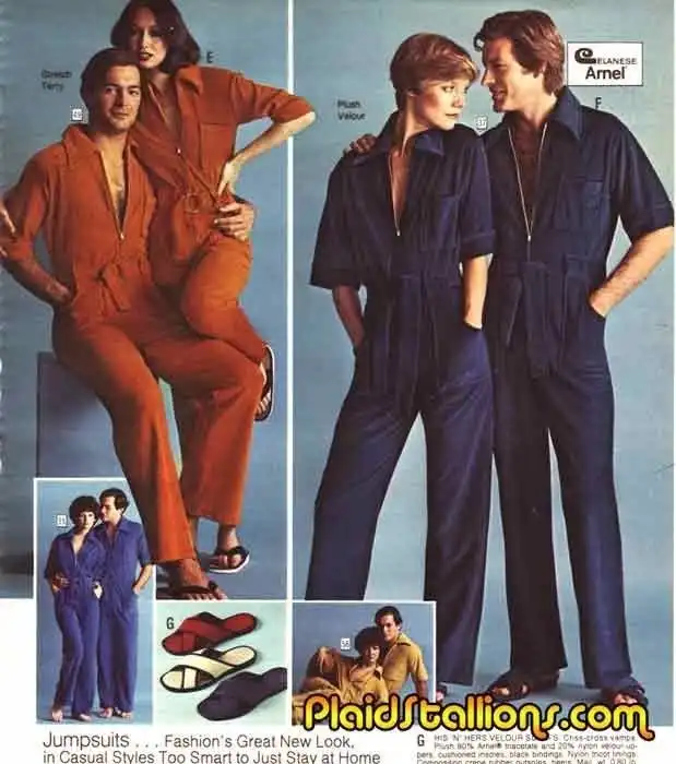 Немного ада из 70-х годов прошлого века. Тогда в моде были комбинезоны, причем не только женские, но и мужские. По заявлениям рекламщиков, в комбезе из полиэстера мужчина выглядит сексуально. Особенно, если у него есть усы и затемненные очки с толстенными линзами