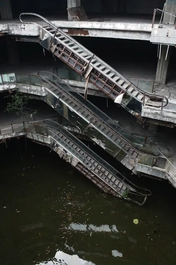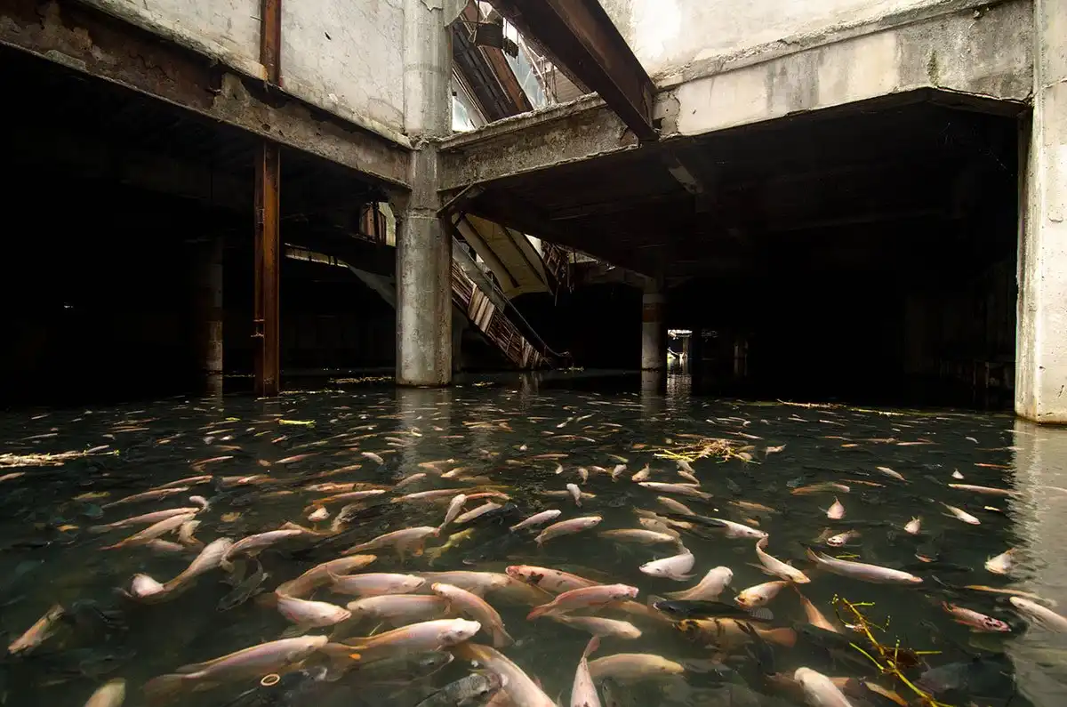 Заброшенный торговый центр New World в столице Таиланда превратился в огромный аквариум. Его нулевой этаж затоплен водой, и там плавают тысячи карпов.