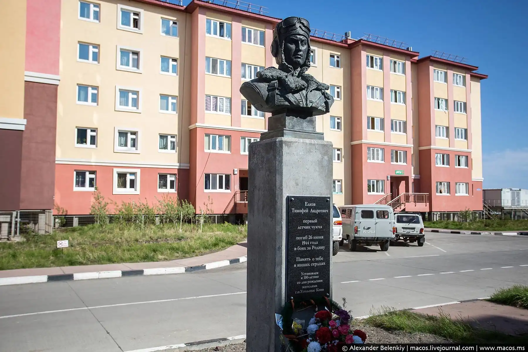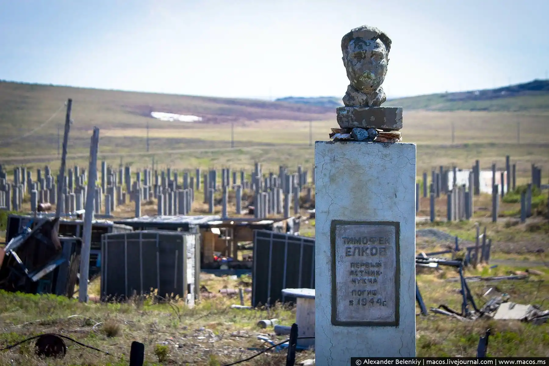 Посреди мёртвого города стоит памятник Тимофею Елкову, первому чукче-лётчику, погибшему в Великую Отечественную. Бюст стоит на камушках…