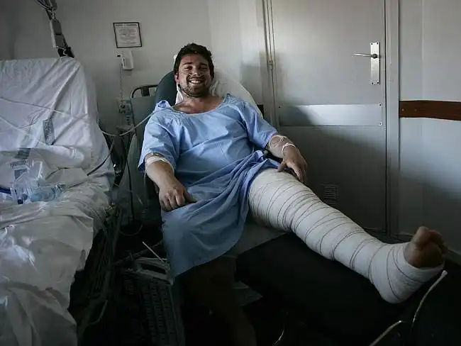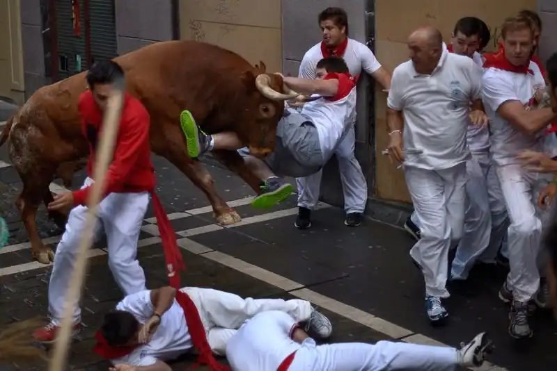 С маниакальным упорством каждый год туристы и коренные испанцы бегают от бычков по тесной улице. Кого-то уже нет с нами, но чаще всего такие гонки заканчиваются травмами. В этом году попал под бычка австралиец Джейсон Гилберт. Среди его многочисленных травм - проколотое легкое, сломанные ребра и порванное бедро.