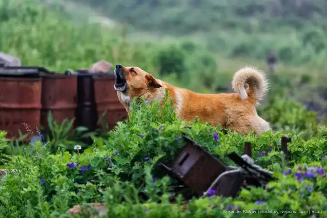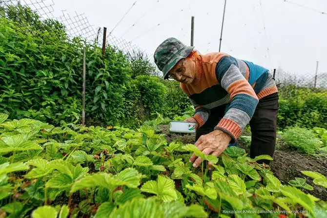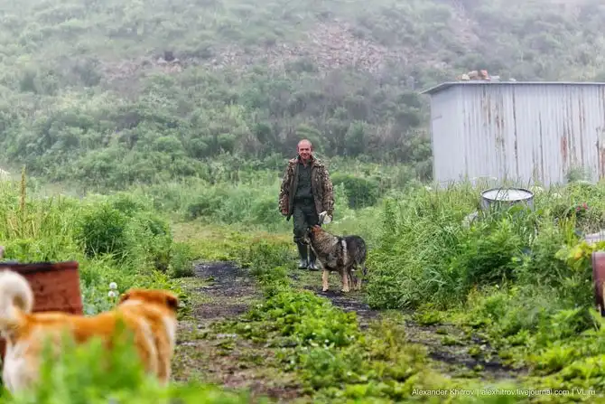 Издалека кажущийся маленьким и совершенно непригодным для жизни, остров Скрыплев оказался приветливым местом. Среди отвесных скал стоит маяк с уютно пристроенным к нему домом – царская постройка: метровой толщины стены, высокие арочные потолки. Во дворе – две собаки, которые по размерам могут соперничать с небольшим медведем, но совершенно не умеют кусаться. По всему склону разбросано несколько огородов, на которых растет зелень, ягода, овощи.