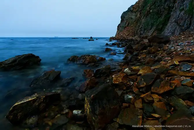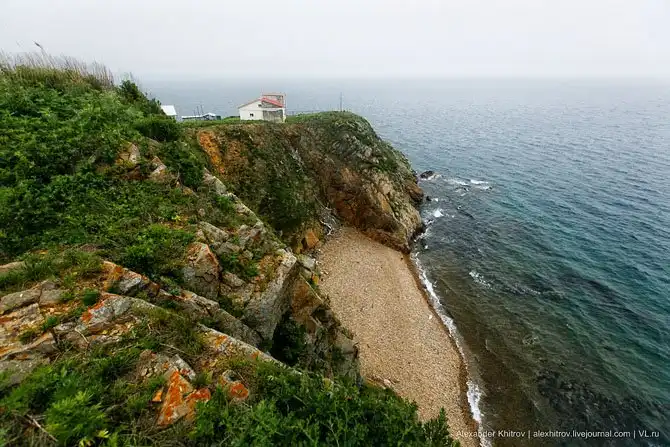 Крутые неприступные скалы с одной стороны, широкая гостеприимная дорога – с другой. По берегу хаотично бегает невероятное количество крабов, дует влажный ветер – атмосфера поистине расслабляющая. А в это время маяк Скрыплева – самый старый и мощный маяк Приморья, толкающий световой луч на два десятка миль вперед, каждую секунду готов к работе.