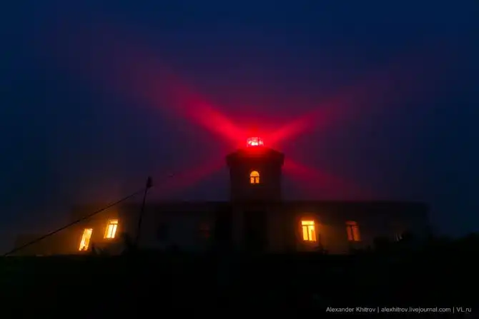В 21:54 огня маяка Скрыплева уже пронзали туманный навес. Наверное, это был единственный плюс тумана – хорошо видно красные луки основной лампы маяка (есть еще и дублер).