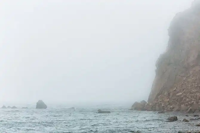 На острове мы пробыли ровно сутки. И ровно сутки он был окутан густым туманом. Лишь изредка были небольшие прояснения и мы могли видеть маяк Басаргин, Русский мост, Океанариум на Русском острове. Но потом снова все заволакивало, и лишь протяжные громкие гудки кораблей откуда-то с далека нарушали тихое спокойствие острова.