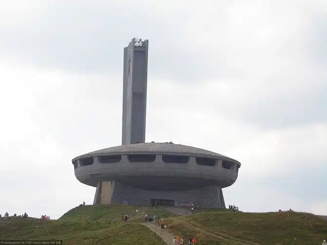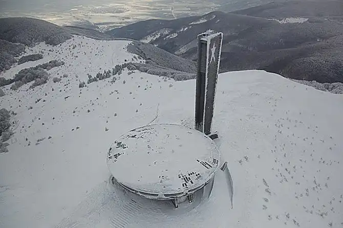 Сооружение, с виду напоминающее гигантское бетонное блюдце или летающую тарелку, «припаркованную» на вершине горы, представляет собой монумент, воздвигнутый в 1980-х годах в честь Болгарской коммунистической партии.