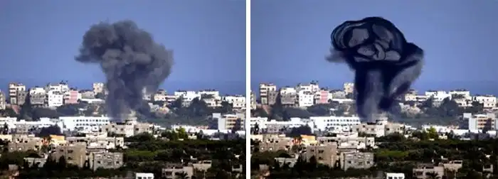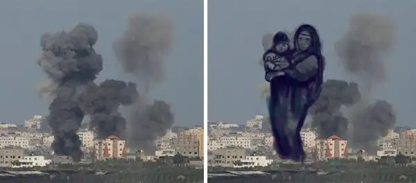 Они рисуют трогательные картины поверх фотографий с дымом, поднимающимся над местами попадания израильских ракет.