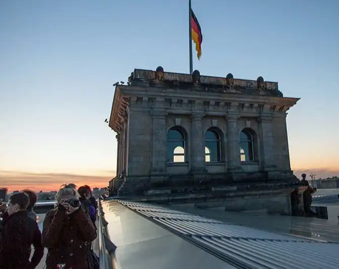 Закат: Используя рейхстаг в Берлине в качестве фона, Питер делает снимок своей подруги в лучах незабываемого заката.