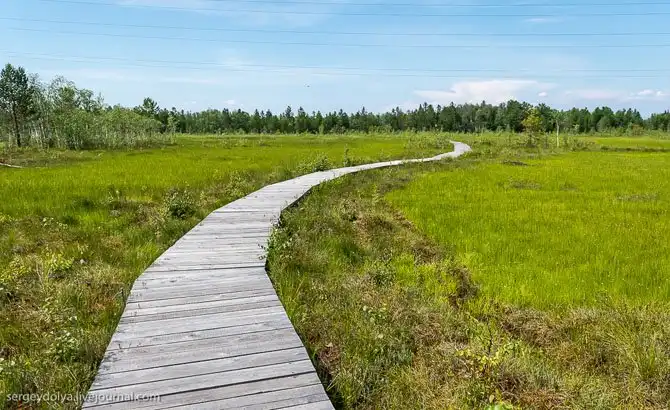 Экотропа закольцована и часть ее проходит через болото, где растет росянка английская. Это насекомоядное растение, которое поедает комаров и разную мошкару: