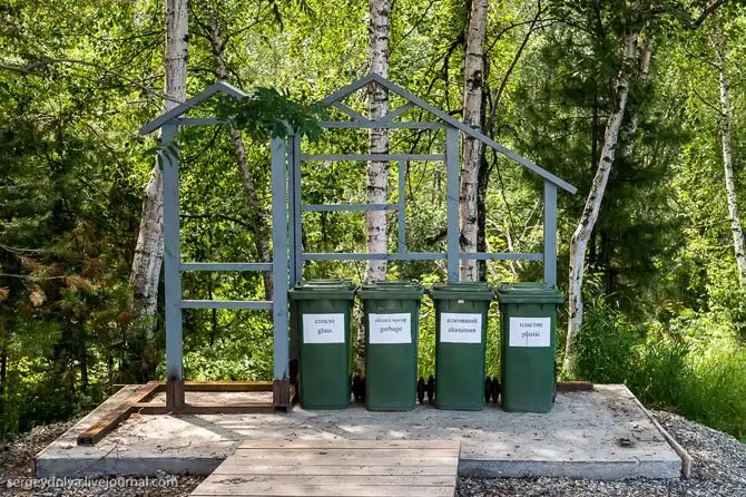 Дальше пошли «в поля». В поселке Танхой и на всей обитаемой территории заповедника налажен раздельный сбор мусора. Инициатива принадлежит начальнику отдела туризма и рекреации Василию Мальцеву и это – реальный пример роли личности в локальной истории. Даже сами сотрудники заповедника не верили, что раздельный сбор будет работать, но потом все привыкли и сейчас возят мусор на переработку за 60 км от поселка: