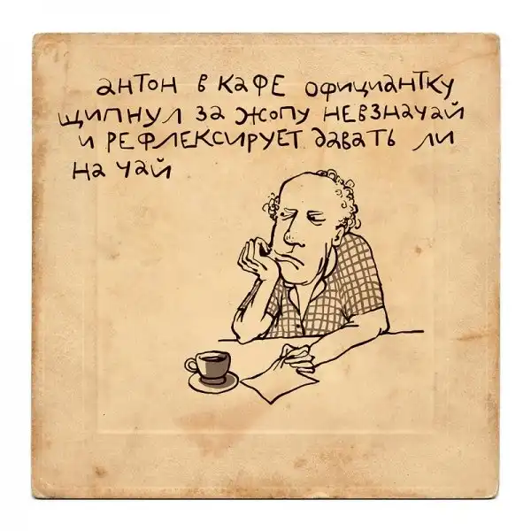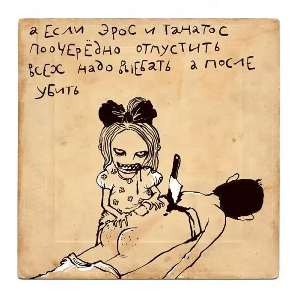 Художница Ирина Сазонова, среди всего прочего, рисует очень примечательные картинки — в нарочито небрежном, примитивистском «лубочном» стиле. Каждый рисунок сопровождается рифмованным двустишием — иногда абсурдным, иногда жизненным, но всегда неожиданным, ироничным и метким. Таких маленьких шедевров у нее много, и это хорошо — их хочется рассматривать еще и еще.
