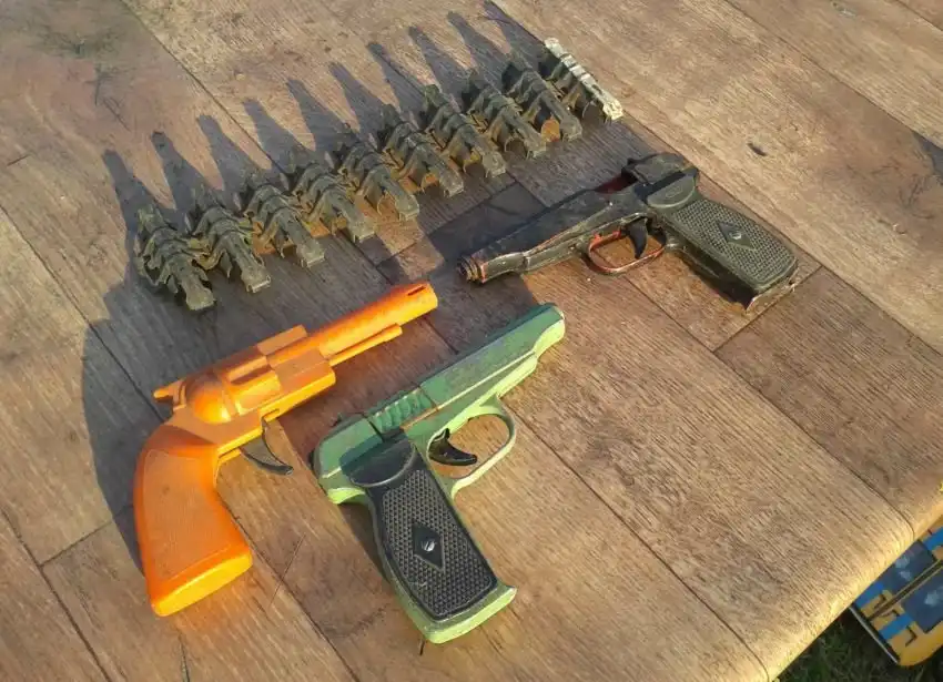 У меня до сих пор лежит металлический пистолет, схожий с ПМ, как на фото. Был красным, потом стал черным)