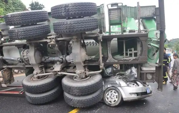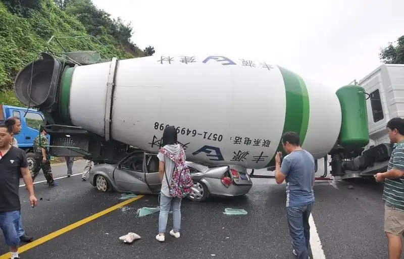 Жуткий инцидент произошел на одной из дорог Ханчжоу, провинция Чжэцзян. Грузовик с бетономешалкой потерял равновесие и опрокинулся прямо на легковушку с двумя женщинами. Водитель вызвал спасателей, но те ничего не могли сделать до тех пор, пока не прибыл кран. После того, как бетономешалка была поставлена на колеса, пожарным удалось освободить женщин - ни одна из них серьезно не пострадала.