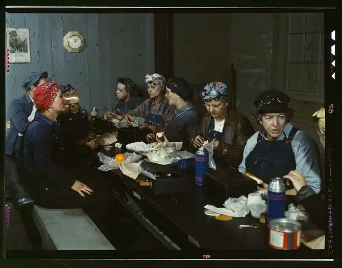 Работницы железной дороги за обедом. Многие из них — жены и даже матери мужчин, ушедших на войну. 1943 год.
