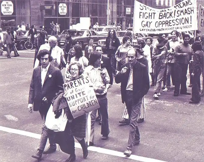 Джианн Мэнфорд идет рядом со своим сыном-геем во время гей-парада. 1972 год. Позже Джианн создала группу «Родители, семьи и друзья лесбиянок и геев».