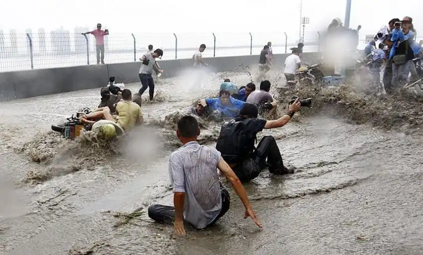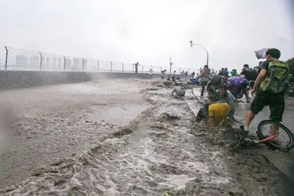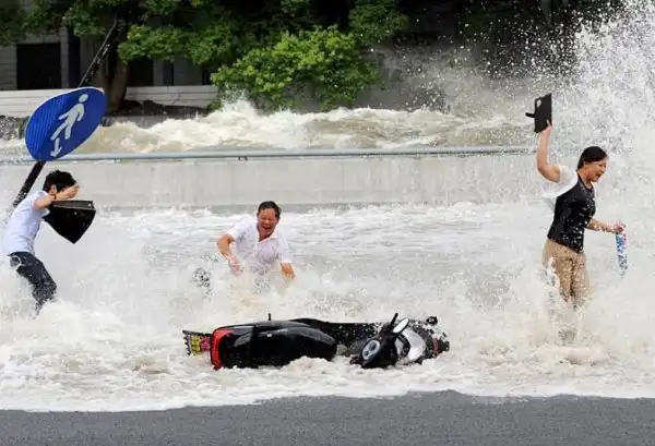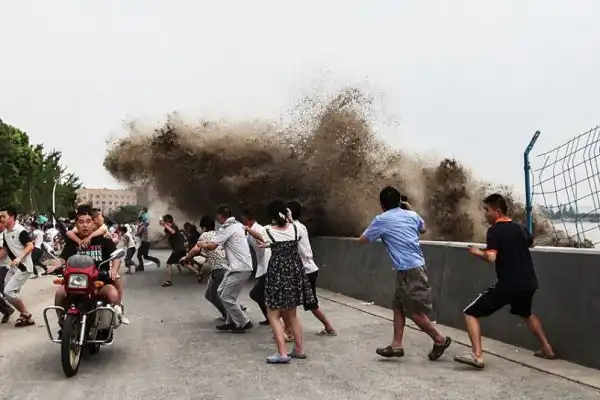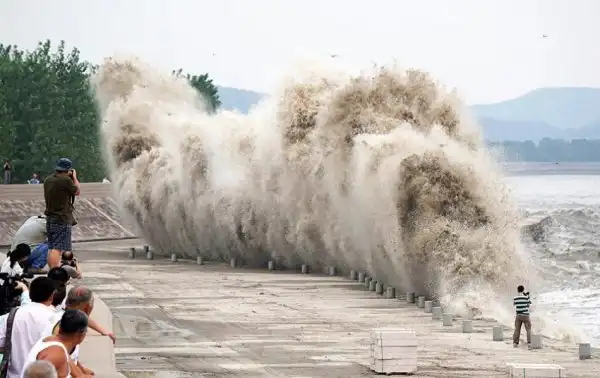 Эффектное зрелище прилива реки Цяньтан обычно приходится на 18-й день восьмого месяца по китайскому лунному календарю. В этом году, прилив был усилен суперлунием, и волна пришла огромных размеров. Волна ворвалась на набережную, многие зрители пострадали.