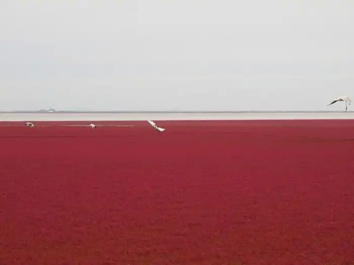 Китайский пляж, который вы сейчас видите на фото, действительно красного цвета, и ваш монитор по-прежнему отображает правильные оттенки и цвета ;) Предлагаю вам узнать в продолжении поста, почему на этом берегу все окрасилось в кроваво-красный цвет.