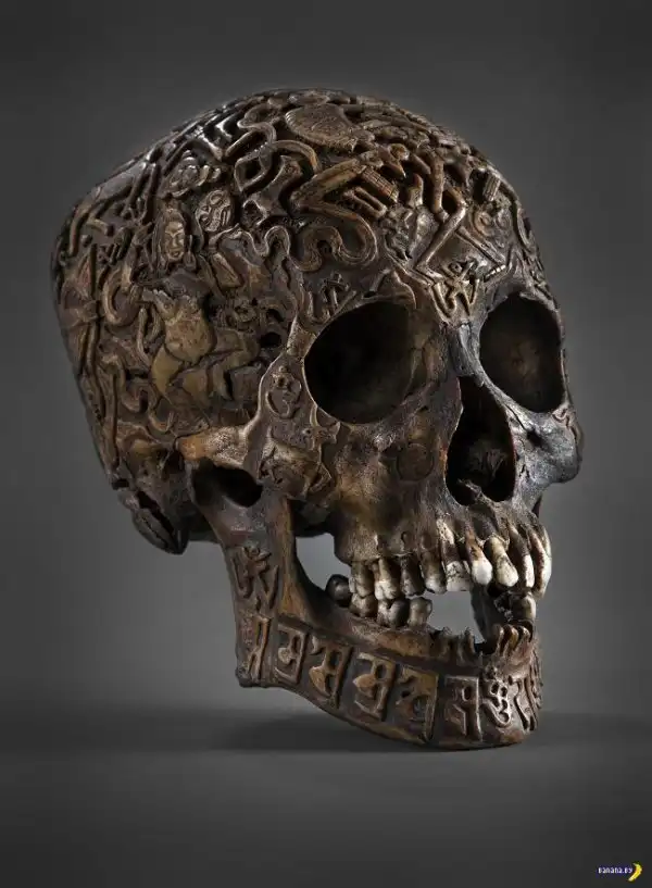 А в память о дедушке, например, могут сделать из его черепа красивое резное украшение для дома. Вот фотографии подобного "аксессуара", который был куплен в антикварном магазине в Вене. Вещь очень редкая, ученые с большим интересом изучали символы и знаки на нем. Оказалось, что на черепе вырезаны советы от покойника своим потомкам относительно правильного выбора жизненного пути. И череп передавался из поколения в поколение, а много лет назад его подарили приехавшему из Австрии доктору, который спас одного из членов семьи тибетцев. Возраст экспоната оценивается примерно в 300 лет.