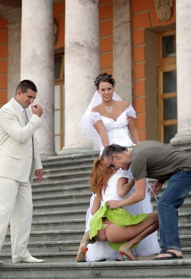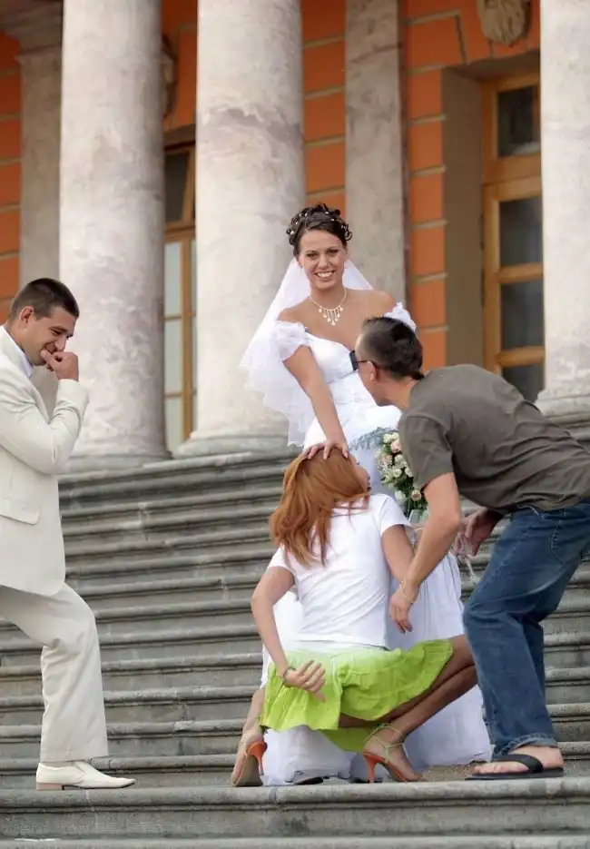 Подружка невесты на свадьбе решила немного подурачиться во время фотосессии молодых.