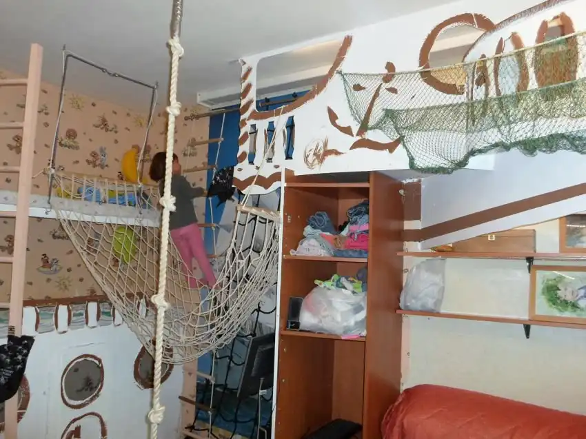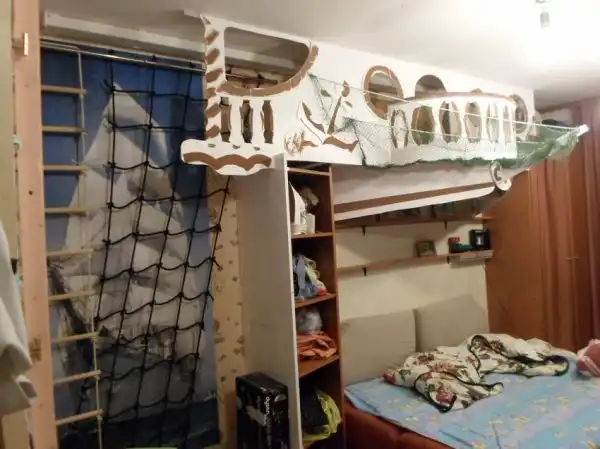 Прошлым летом я построил игровую зону в для двух дочерей прямо в комнате. идея появилась от фотообоев, которые в той весной были в продаже. Парусный корабль на фоне моря. был главный недостаток - высота потолка 2,60 и кораблик был мал (можно только ползком)