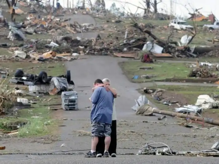 Мать и сын в Конкорд, Алабама, около их дома, который был полностью разрушен торнадо.