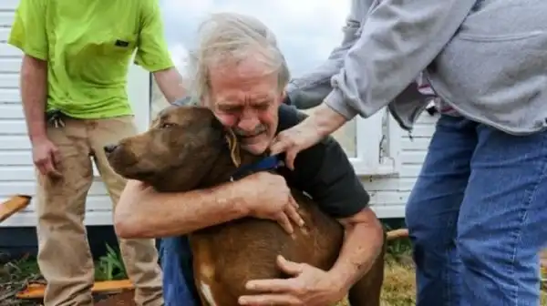 Грег Кук обнимает свою собаку, которая была найдена внутри его дома в Алабаме, разрушенного в результате торнадо.