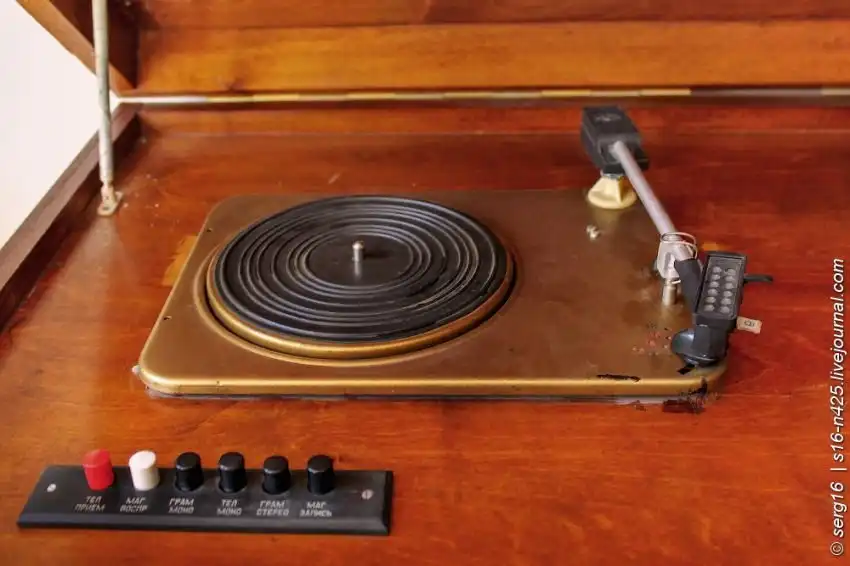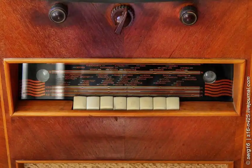 Днепр 3. У десятки были уже не кнопки, а поворотные ручки. Комбайн действительно реальный, но с более современным, не родным кинескопом. И, заметьте, это натуральное дерево, а не галимая ДСП.