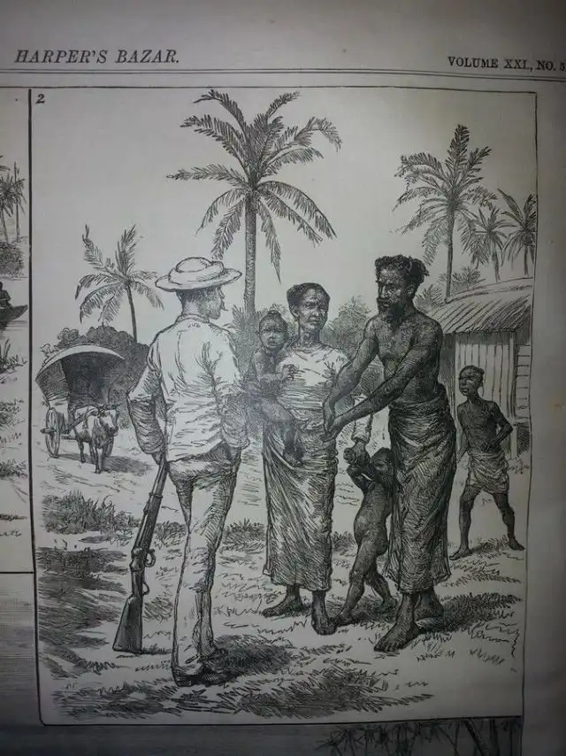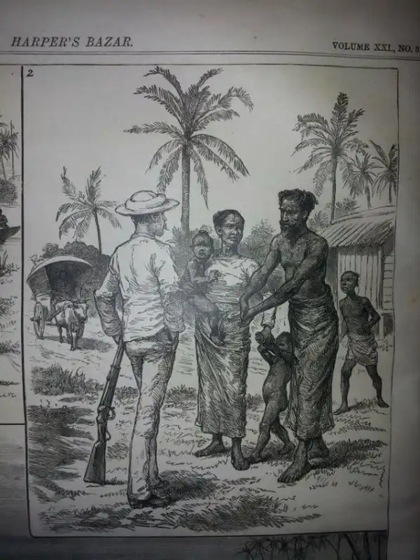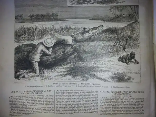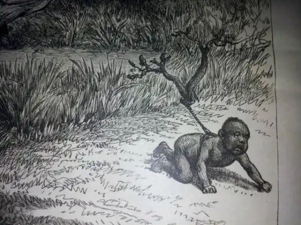 Наиболее интересный момент здесь – приманка, используемая бесстрашным охотником, – ребёнок, привязанный за пояс к небольшому деревцу. В то время англичане не заморачивались никакими общечеловеческими ценностями, а смотрели на вещи просто. Поэтому на картинке только один человек - охотник, всё остальное – природа.