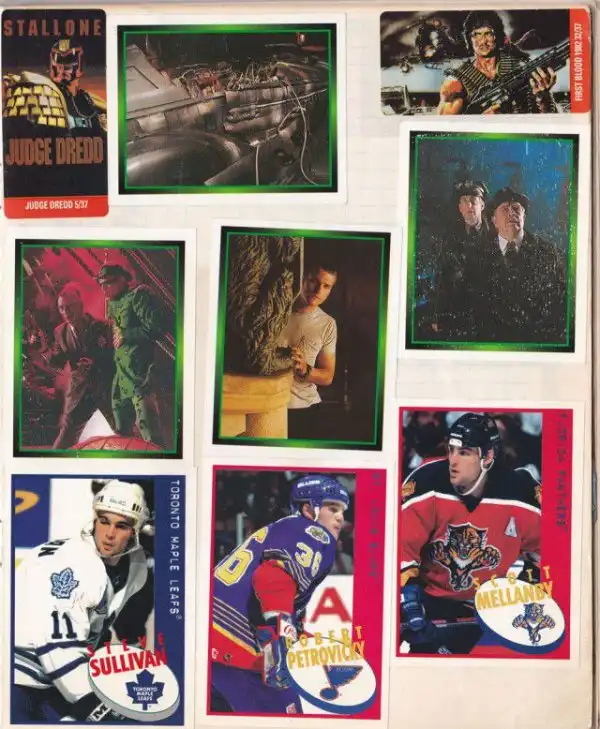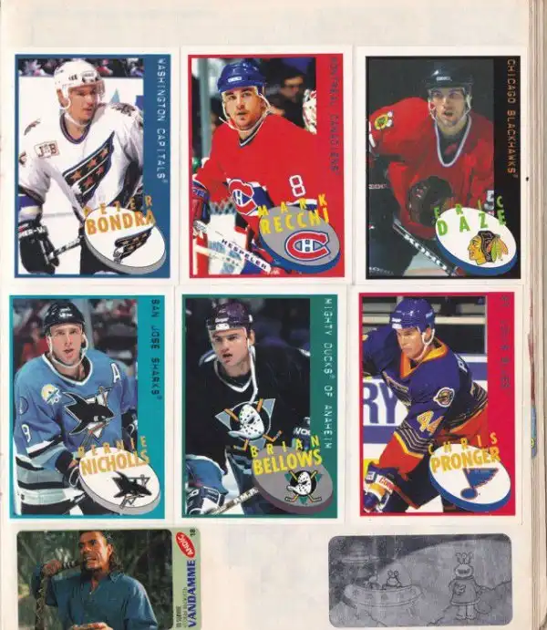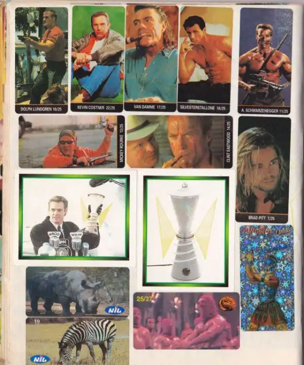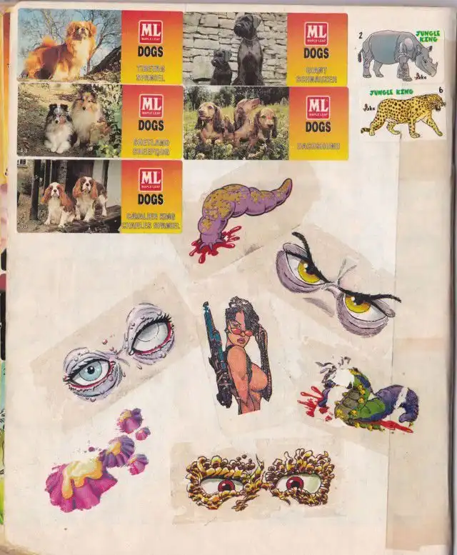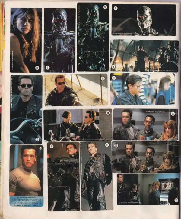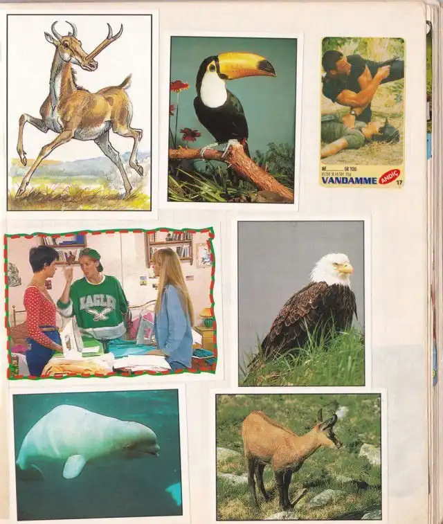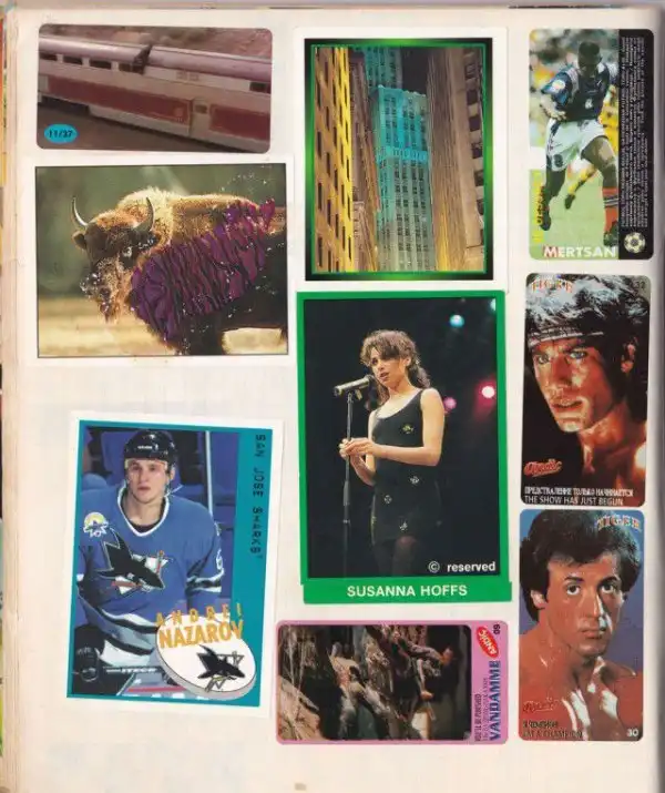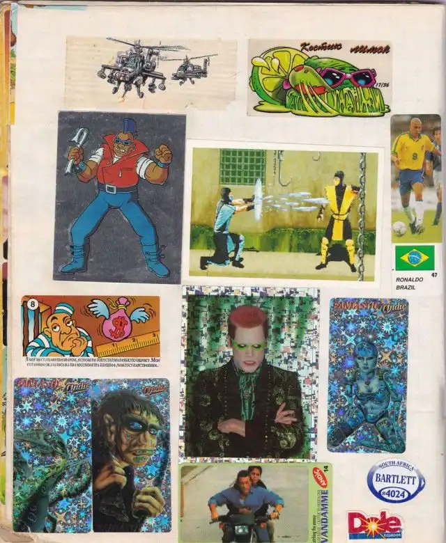 Потом появились такие большие тетради-журналы, формата А4 на различные тематики: Терминатор, команды НХЛ, Элен и ребята, мир животных, черепашки ниндзя и прочие. Это такие крупные прямоугольные наклейки, которые продавались в специальных конвертах по шесть штук, кажется. Вот и покупали их, вклеивали на свои места. Попадалось много одинаковых, но азарт был неудержимый.