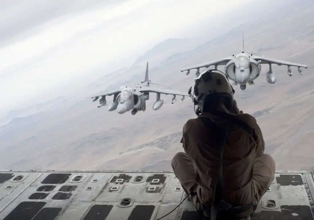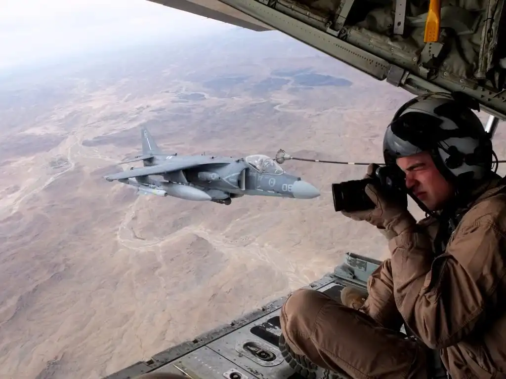 Капрал Грегори Мур из 3-го авиакрыла Морской пехоты США снимает в полете истребители AV-8B Harriers, сидя на открытом люке KC-130J Hercules.
