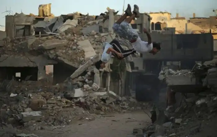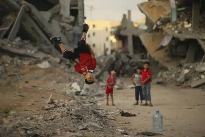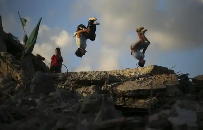 Один из фотографов агентства Reuters заснял подростков, живущих в секторе Газа и занимающихся паркуром на свежих, еще дымящихся руинах.