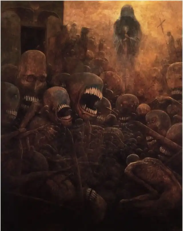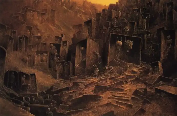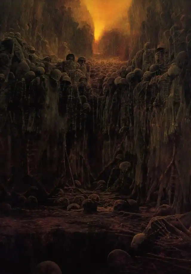 Если спросить у человека, прошедшего войну, как в его представлении выглядит ад, наверняка он опишет именно то, что видел на войне, ибо это и есть самый настоящий ад, только наяву. Польский художник Здзислав Бексиньский прошел через Вторую мировую войну ребенком, и все увиденное его настолько шокировало и запечатлелось в памяти, что уже во взрослом возрасте он создал серию картин, демонстрирующих войну, какой он ее запомнил. Стиль его работ очень необычный, а страшные картины впечатляют и пугают одновременно.