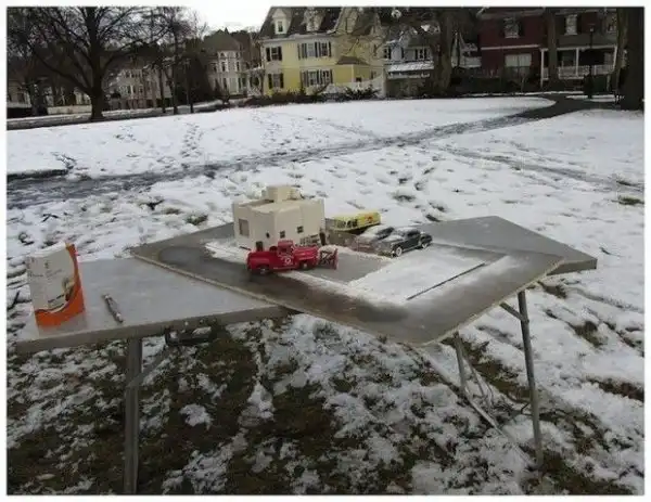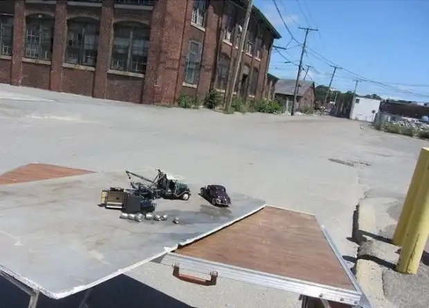 Достигается данный эффект за счёт умелого использования перспективы и точного угла камеры при съёмке. Подобная съёмка увлекает Майкла Пола Смита уже на протяжении 25 лет. И, кстати, аналогичным образом сейчас и особенно раньше создавались кадры многих фильмов, в которых требовалось показать большое количество старой техники. Всё-таки модели авто найти намного дешевле и проще, чем полноразмерные оригиналы.