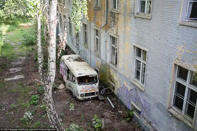 Самое интересное располагается в здании офицерского клуба. Однако, оно забетонировано со всех сторон и попасть туда «легально» абсолютно невозможно. Только, если ломать замок или соорудить лестницу, чтобы залезть через верхние этажи. Мы не стали лезть внутрь. Там точно еще находятся ценные еще не растащенные исторические артефакты.