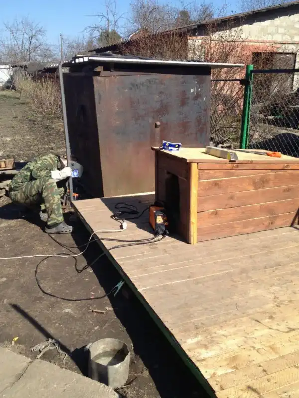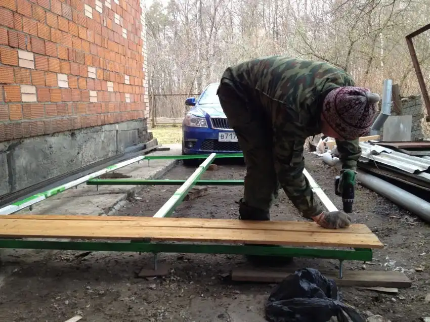 После просушки металла, нужно двигаться дальше. Далее я нашел кучу досок от чернового потолка, хоть они тонковаты для пола, но с учетом того, что собака весит от силы кг - 25, эти доски его спокойно выдержат - решено: ставлю их. Вооружившись шуруповертом и саморезами начинаю подгонять доску к доске. Кое-чего уже начинает получаться.