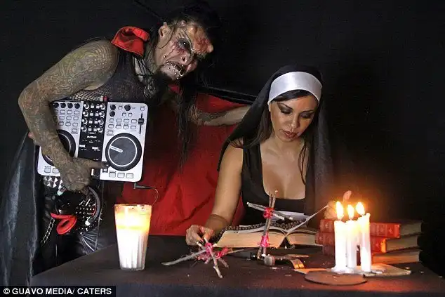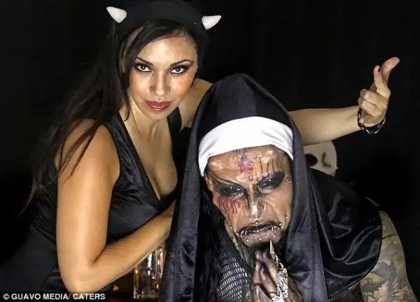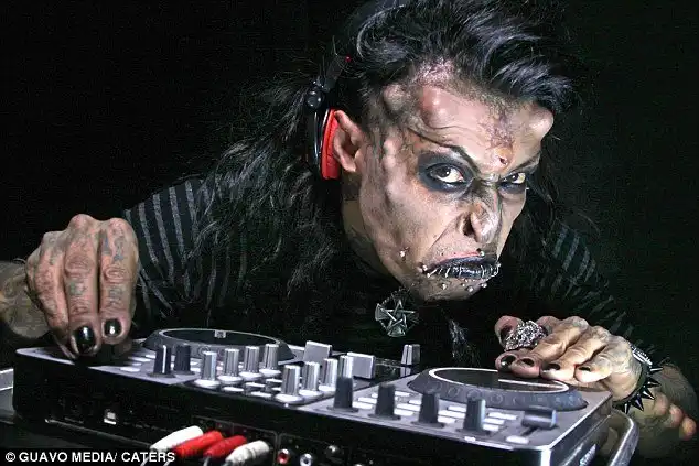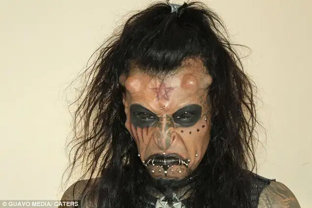 42-летний Caim Mortis потратил 11 лет на преобразование своего тела, у него глазные яблоки татуированы черным цветом, в лоб вставлены импланты в виде рогов, также татуировки и пирсинг по всему телу.