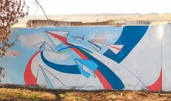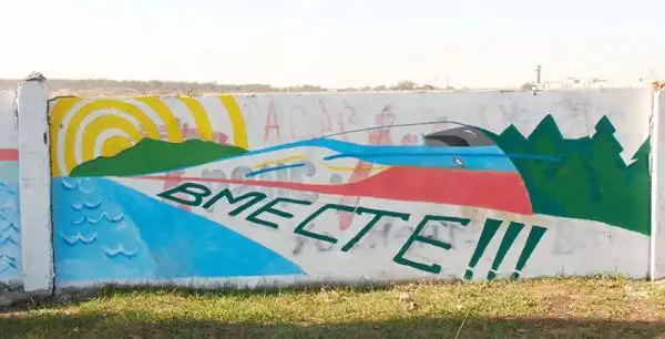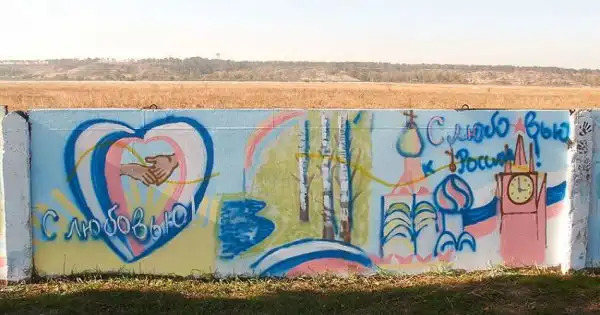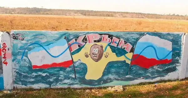 На бетонном заборе вдоль дороги неподалёку от аэропорта в Симферополе