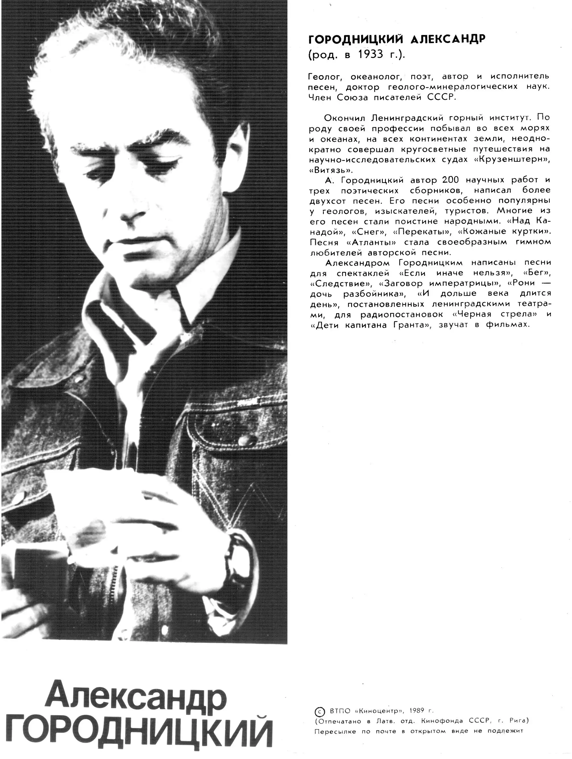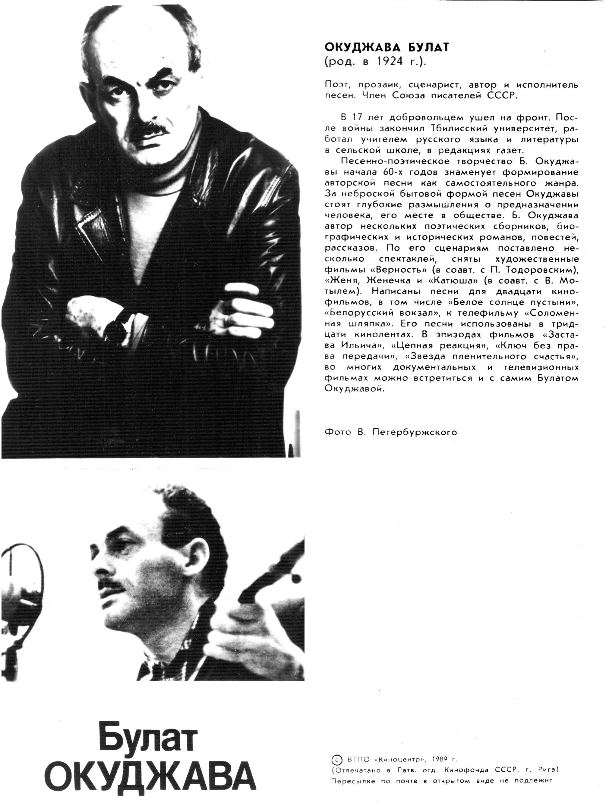 Набор черно-белых открыток-фотографий популярных российских бардов 50-х – 80-х годов двадцатого века. В каждой открытке – краткая биографическая справка. В комплекте – очерк об авторской песне, о связи российских бардов с советским кино.