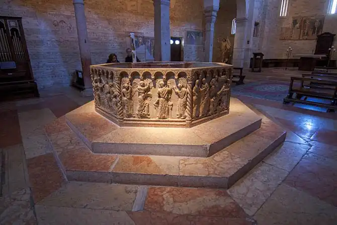 Главное, на что тут стоит обратить внимание — восьмигранная купель конца XII в., вырезанная из единого куска красного веронского мрамора мастером Бриолото.