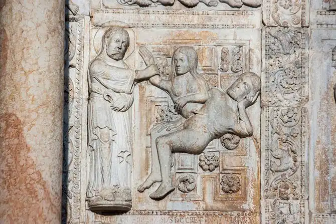 Портал выглядит гораздо более навороченным, чем портал Дуомо за счет 18 боковых панелей. Сюжеты, в основном, библейские, но есть также легендарные и бытовые, посвященные жизни Теодориха Великого. Те, что справа — работа того же мастера Никколо.