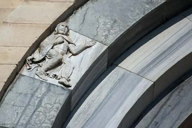Портик создавался местным мастером Никколо. На фото рельефный люнет над входом — по центру «Богородица с младенцем», слева — «Поклонение пастухов», справа — «Поклонение волхвов».