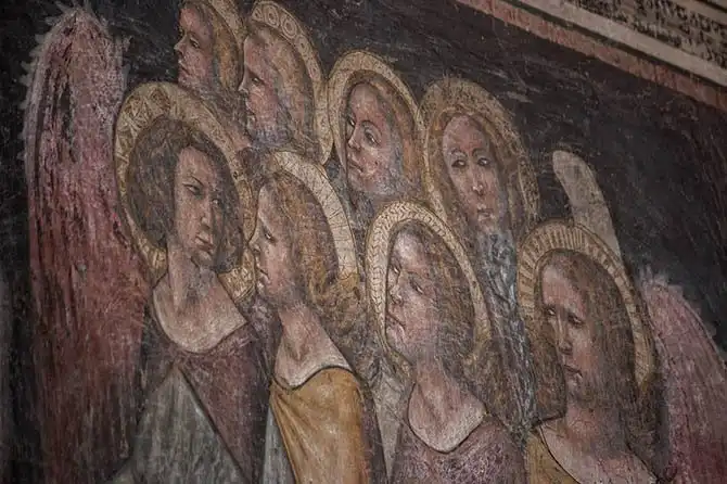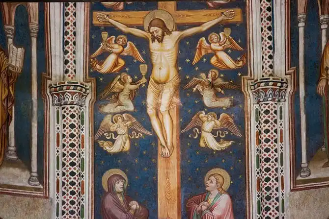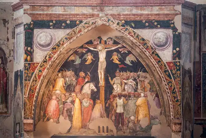 Над на контрфасаде, прямо над входным порталом, видна фреска XIV в. «Распятие» — шедевр Туроне ди Максио, учителя Альтикьеро да Дзевио.