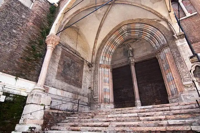 Слева от фасада — гробница кондотьера и мэра Вероны — Джульельмо да Кастельбарко начала XIV в. Это первый пример подобного расположения гробниц (балдахин). Насколько я знаю, характерно только для Вероны. По примеру этой построены расположенные неподалеку более известные «Арки Скалигеров»