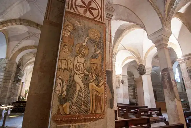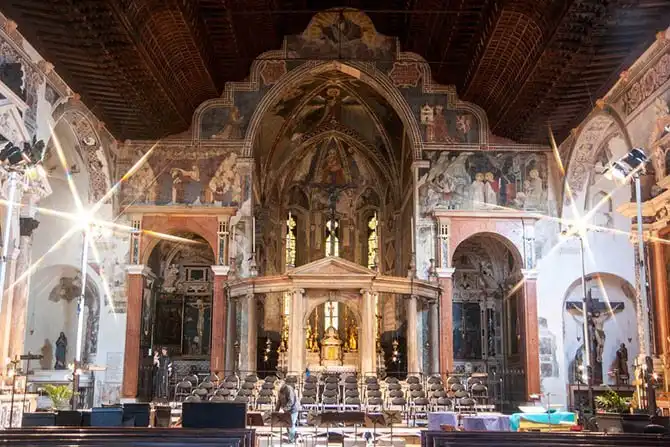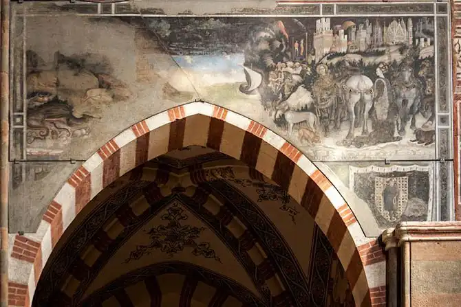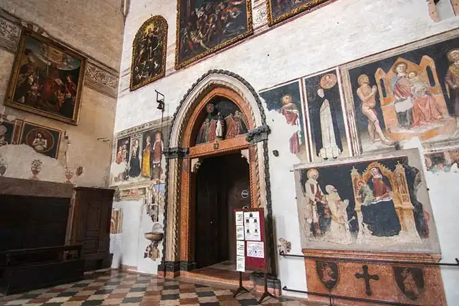 Справа от входа — амвон XIV в. из белого и красного мрамора, окруженный фресками местного художника Мартина ди Верона.