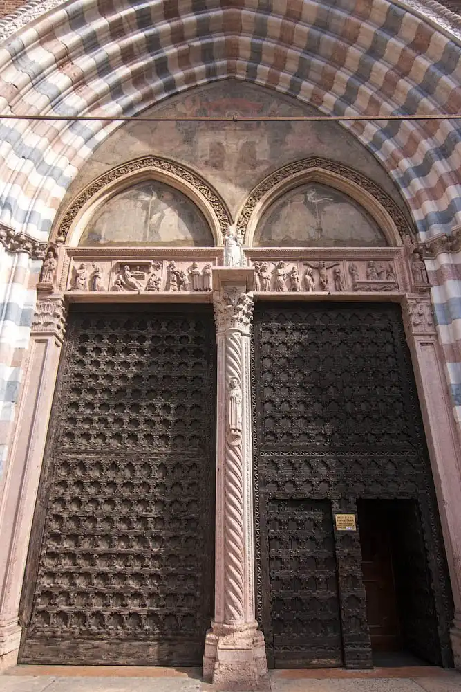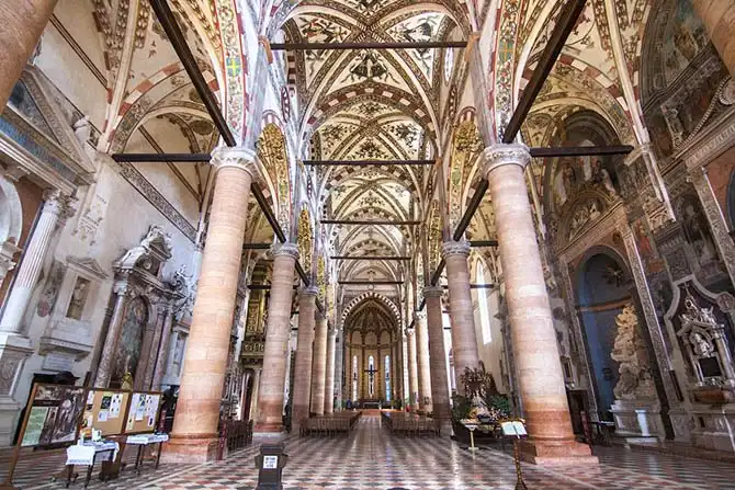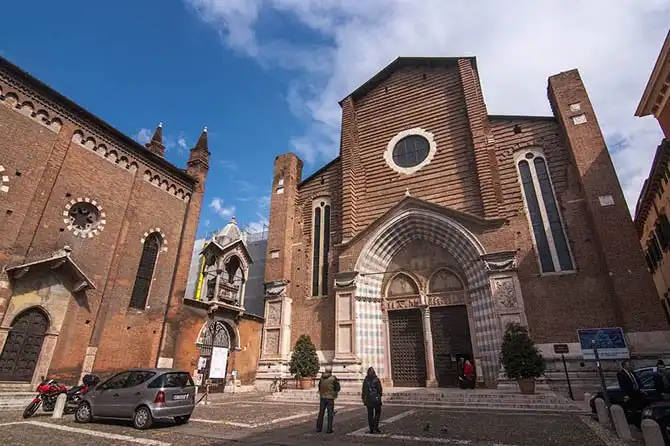 И, наконец, последний из четырех и самый крупный собор Вероны — Сант’Анастасья. Этот собор изначально строили в готическом стиле, с XIII по XIV вв. Церковь строилась одновременно с Занниполо в Венеции, их фасады очень похожи.